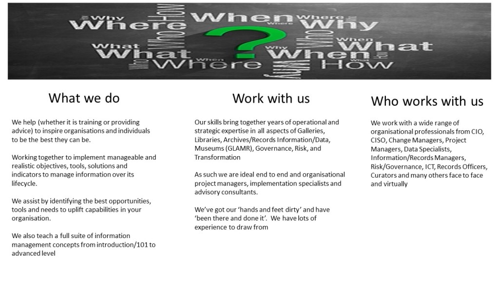 Information, whether it is data, paper or artefacts are a vital business asset. It is essential to ensure that organisations have the correct governance and strategies to protect these assets as they reflect organisational corporate memory and are the most valuable source of evidence of what you do.